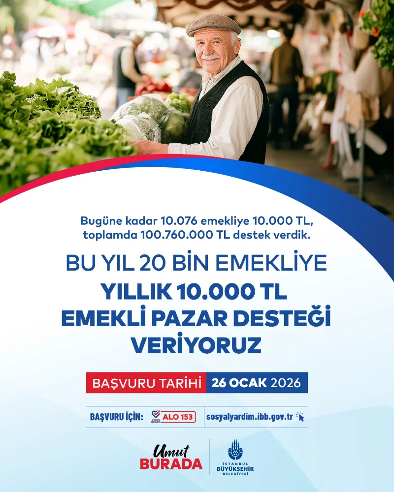 Emeklilere Pazar Desteği başvuruları 26 Ocak Pazartesi (bugün) başladı. Başvurular, Alo 153 Çözüm Merkezi ve https://sosyalyardim.ibb.gov.tr/ adresi üzerinden alınacak.